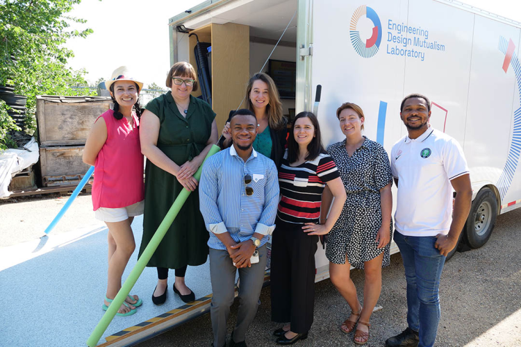 (Left to right, top to bottom) Ines Sanches Rodruguez, Dr. Lori Bradford (PhD), Dr. Renata Mont'Alverne (PhD), Russell Mba, Lindsay Tumback, Esther Kähne and Akinola Ogbeyemi stand in front of the Engineering Design Mutualism Lab mobile trailer. (Photo: Matt Olson)
