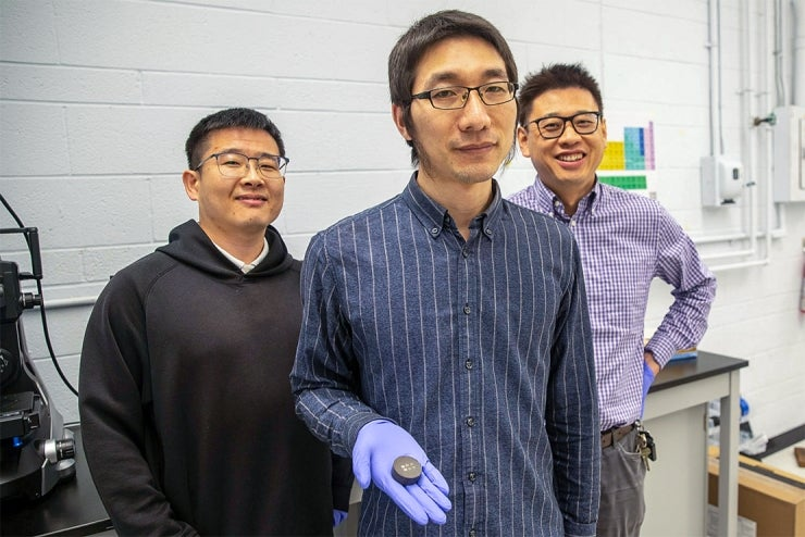 Left to right: Postdoctoral fellow Huicong Chen, research associate Chenwei Shao and Associate Professor Yu Zou of U of T's Faculty of Applied Science & Engineering show a sample of their new metal matrix composite (photo by Tyler Irving)