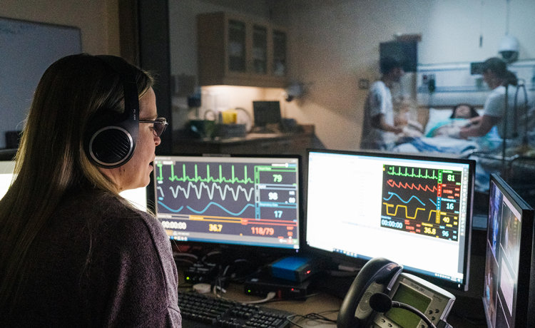 A technician works in Mount Royal's Health Simulation Learning Centre control room during a nursing simulation.