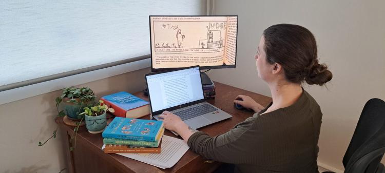 Postdoctoral researcher Erin Gallagher-Cohoon, who is researching the history of children raised by queer parents, looks at a monitor displaying figures in a children's drawing of a court case involving a lesbian mother. The illustration comes from Tree Noiseux-MacKay in Children and Feminism by the Lesbian and Feminist Mothers Political Action Group.