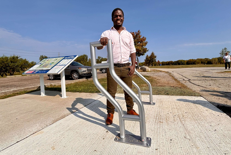 Jimmy Mugenyi, a Mechanical Engineering Technology student at St. Clair College, poses with bike racks he designed for the Malden Park Trailhead on Sept. 19, 2025. (Rich Garton/St. Clair College)