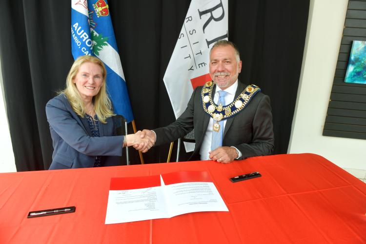 On Monday, June 20, Aurora Mayor Tom Mrakas was joined by York University President Rhonda Lenton at a Memorandum of Understanding (MOU) signing at Aurora Town Hall.