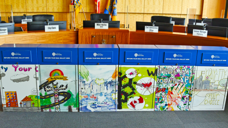 In partnership with School District 41, the City of Burnaby invited local students to participate in an art competition to design a wrap for mail ballot boxes for the 2022 local government election. The theme was "It's 2022 - Why Vote?"