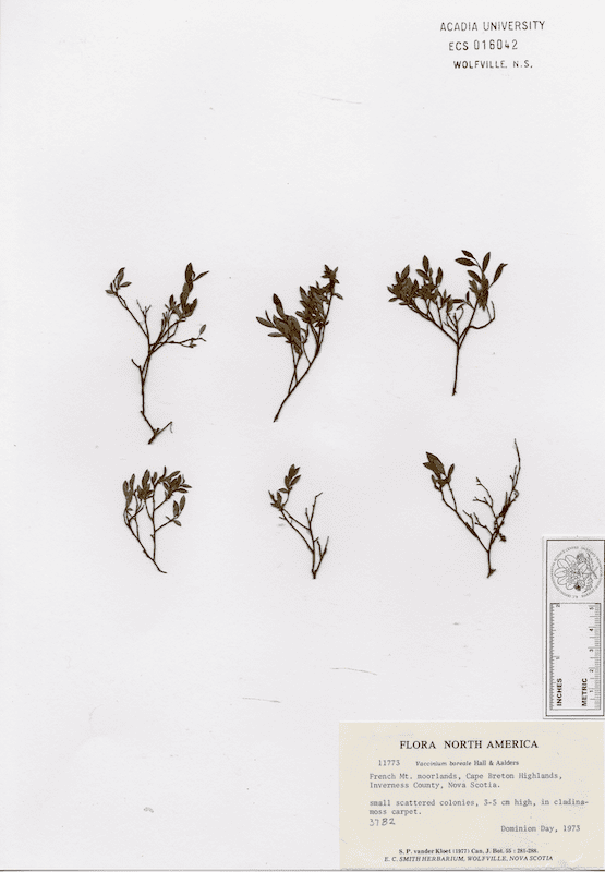 This sizeable collection is affectionately known as "Sam's Blueberries". The late Dr. Sam van der Kloet was a professor of Biology, botanist, and past curator of the E.C. Smith Herbarium. Sam was renowned as the world's leading expert in the taxonomy and ecology of Vaccinium species, which are most famous for blueberries and cranberries. Regrettably, Dr. van der Kloet passed unexpectedly in 2011, leaving his world-class collection unprocessed. His collection encompasses a lifetime of work with his specimens collected from 1973 to 2011; which include samples from at least 28 countries.