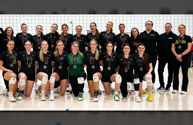 Saints Women's Volleyball team sporting OCAA silver medals after narrowly losing to the Humber Hawks on Feb. 28, 2026. (SOURCE: Saints Athletics)