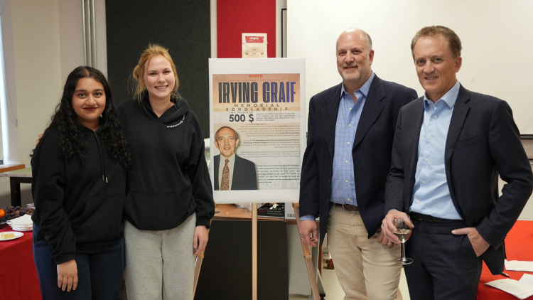 Irving's sons Michael and Paul both gave moving speeches, before officially unveiling the new scholarship. Congratulations to the inaugural winners: second-year students Tasnim Hossain and Charlotte Boelen, who will each receive a cheque for $500. Photo from left to right: scholarship winners, Tasnim Hossain and Charlotte Boelen, next to Paul Graif and Michael Graif.