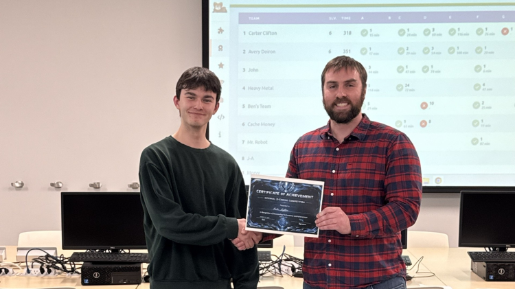 Carter Clifton, left, finished in first place in the StFX Department of Computer Science programming competition. He is pictured here with event co-organizer Dr. Milton King.