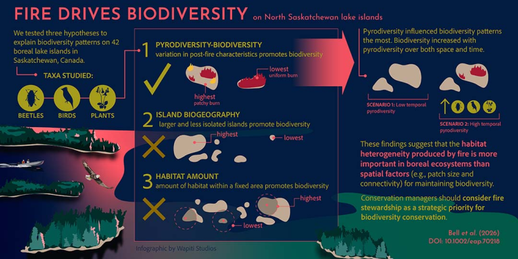 Dr. Aaron Bell (PhD), a USask alumni, closely studied the biodiversity of birds, plants, and beetles on a series of lake islands in Lac la Ronge Provincial Park. These island ecosystems have burned at various times throughout the last 230 years, providing unique insights into how changing wildfire patterns are impacting biodiversity - or the variety of living things in a given area - on the nearby mainland.